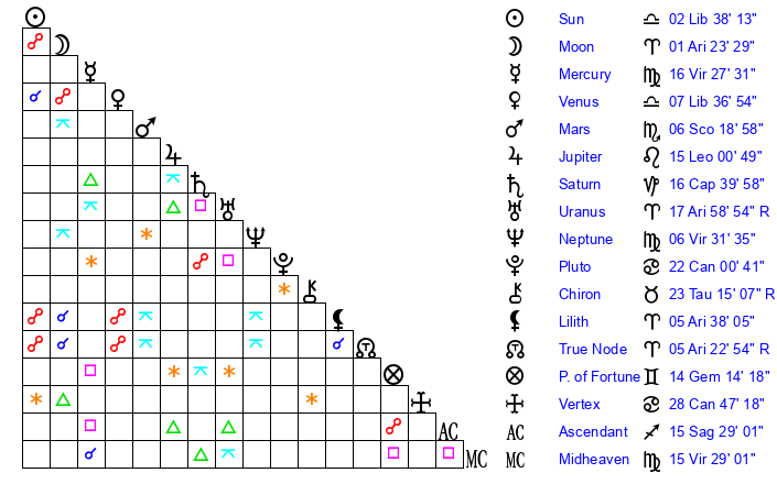 | Moon | 1 Aries 24 | 27 Scorpio 46 | 6 Virgo 26 |