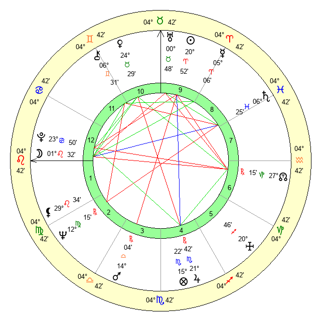 | Moon | 1 Leo 32 | 7 Libra 43 | 7 Scorpio 33 |