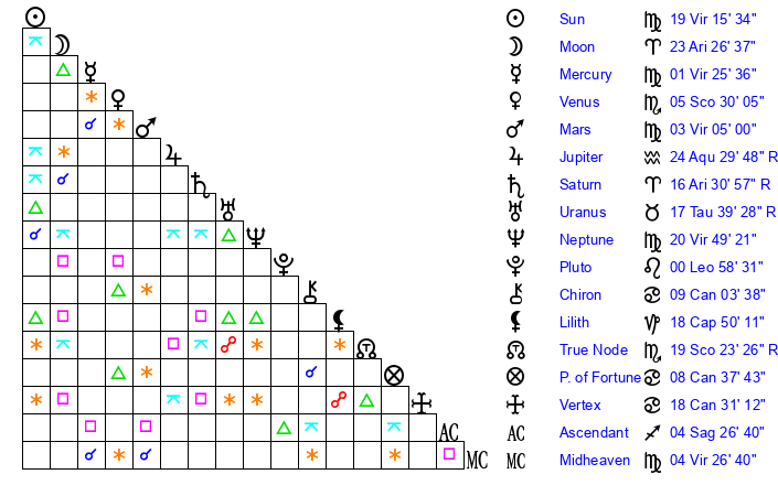 | Neptune | 20 Virgo 49 | 1 Aries 2 | 23 Virgo 15 |