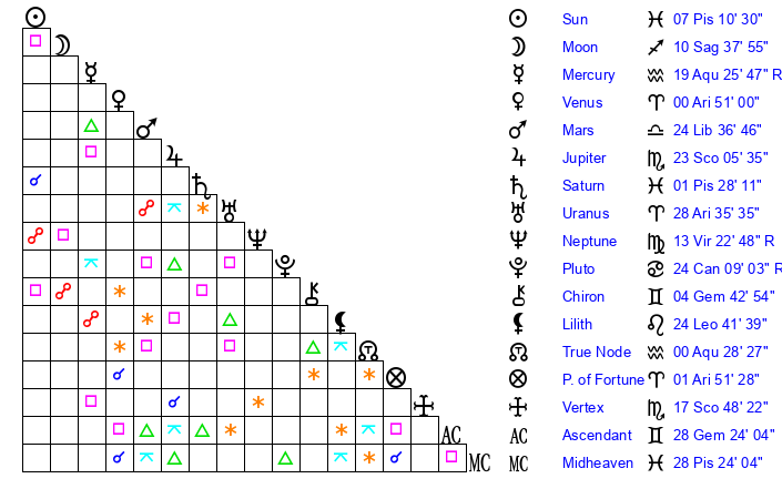 | Sun | 7 Pisces 10 | 8 Pisces 21 | 5 Gemini 28 |