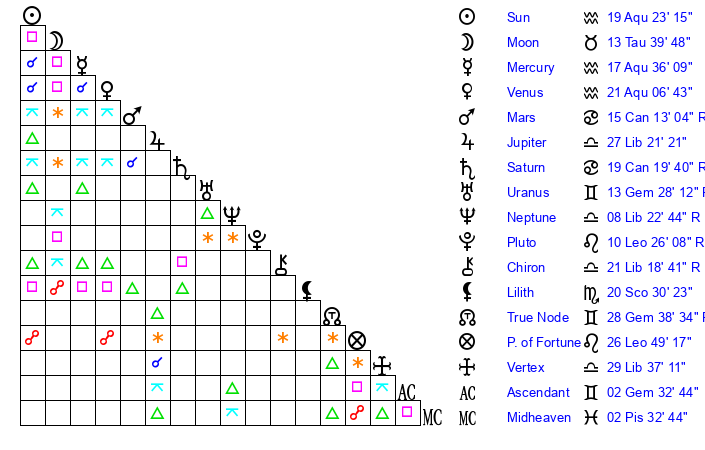 | Moon | 13 Taurus 43 | 3 Cancer 57 | 28 Pisces 53 |