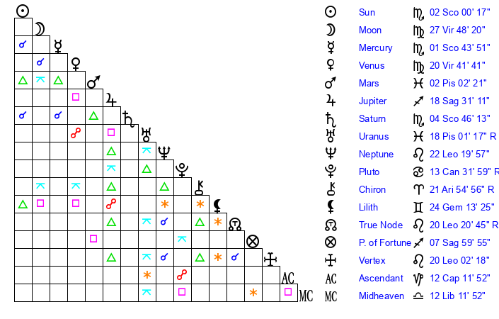 | Moon | 27 Virgo 48 | 18 Sagittarius 11 | 17 Gemini 36 |