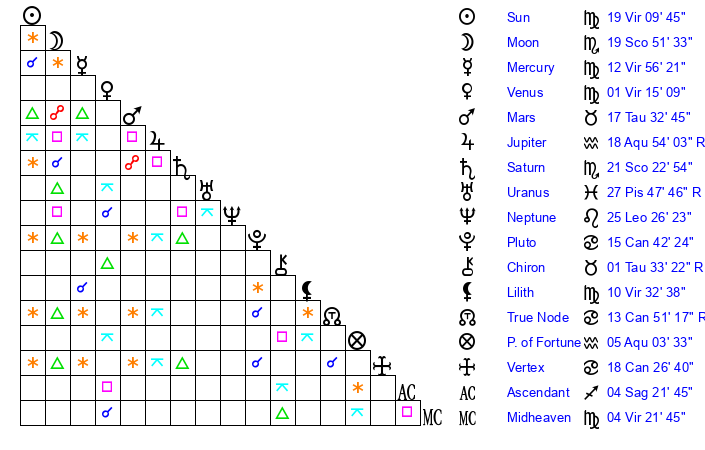 | Moon | 19 Scorpio 54 | 27 Taurus 2 | 15 Cancer 30 |