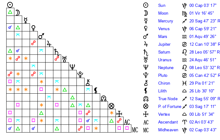 | Mercury | 20 Sagittarius 47 | 14 Sagittarius 45 | 17 Aries 5 |