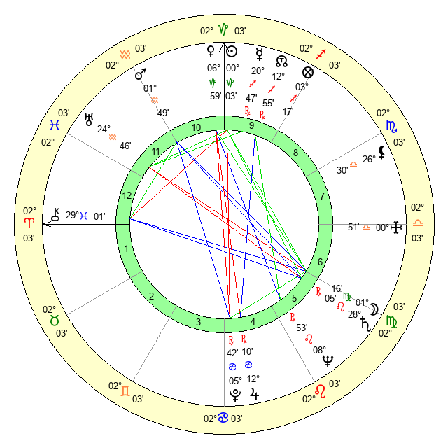 | Moon | 1 Virgo 19 | 0 Aquarius 40 | 2 Leo 20 |