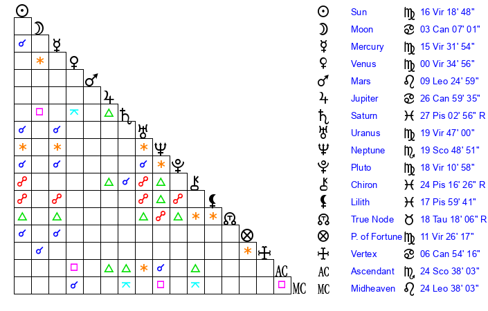 | Sun | 16 Virgo 19 | 17 Virgo 1 | 14 Scorpio 35 |