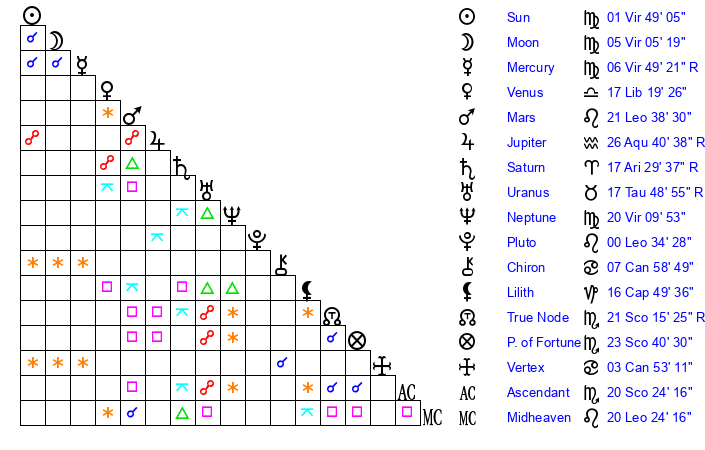 | Neptune | 20 Virgo 10 | 1 Aries 30 | 22 Virgo 59 |