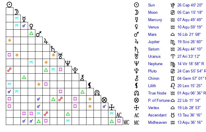 | Mercury | 7 Aquarius 50 | 13 Capricorn 40 | 16 Aries 15 |