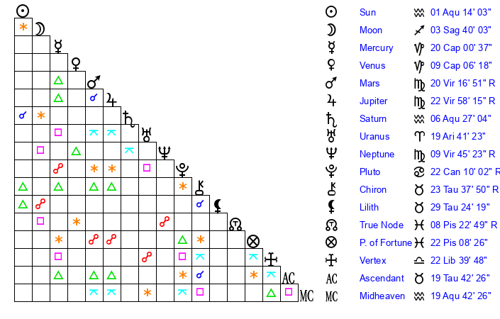 | Saturn | 6 Aquarius 38 | 16 Pisces 17 | 15 Aquarius 39 |
