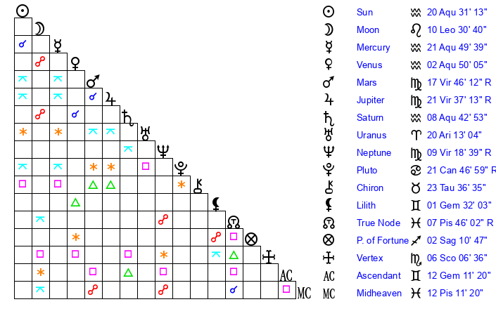 | Venus | 2 Aquarius 50 | 3 Aries 42 | 27 Taurus 2 |