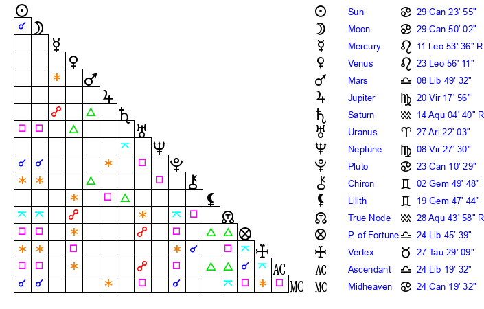 | Pluto | 23 Cancer 10 | 2 Aquarius 38 | 24 Cancer 45 |