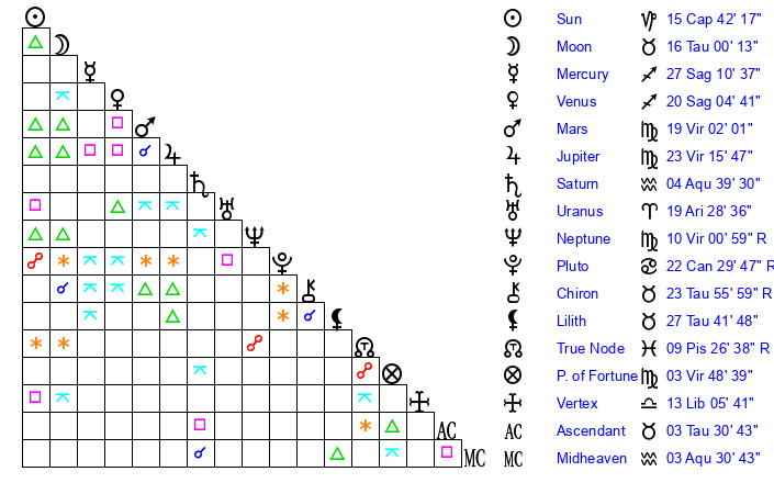 | Moon | 15 Taurus 59 | 9 Aries 21 | 20 Virgo 4 |