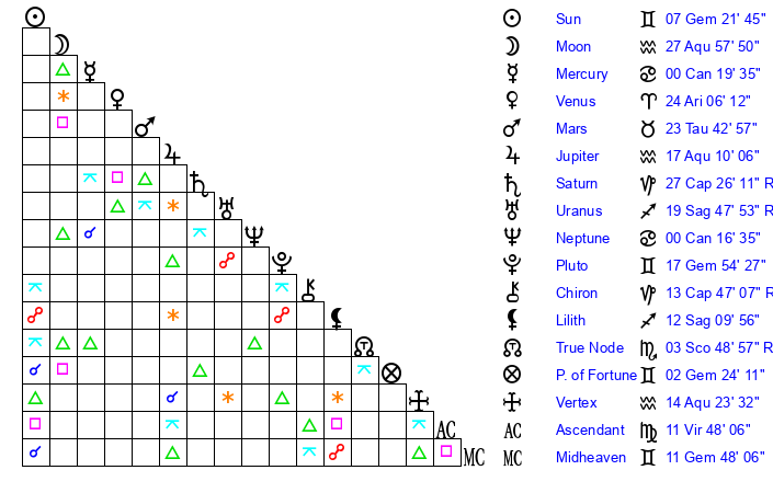 | Jupiter | 16 Aquarius 52 | 27 Gemini 29 | 7 Aquarius 8 |