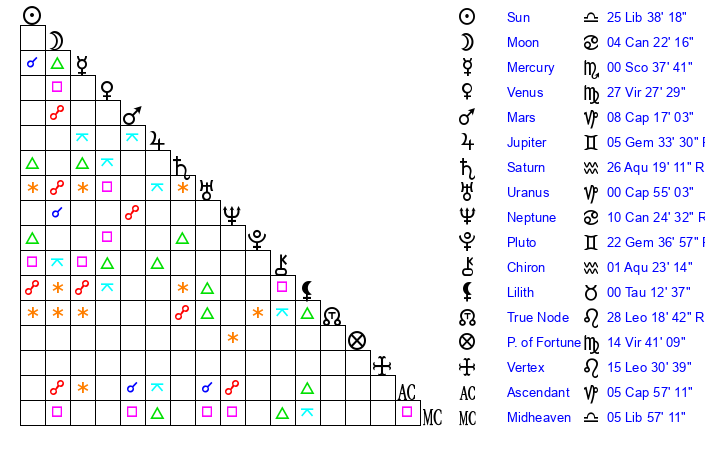 | Venus | 27 Virgo 28 | 7 Libra 14 | 27 Aquarius 42 |