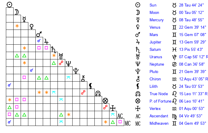 | Sun | 28 Taurus 45 | 29 Taurus 56 | 22 Virgo 54 |