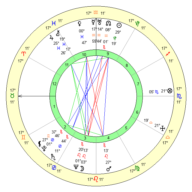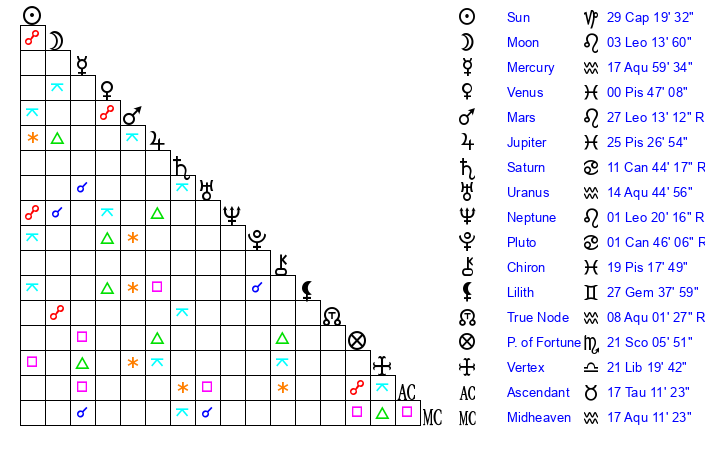 | Sun | 29 Capricorn 19 | 0 Aquarius 53 | 17 Taurus 44 |