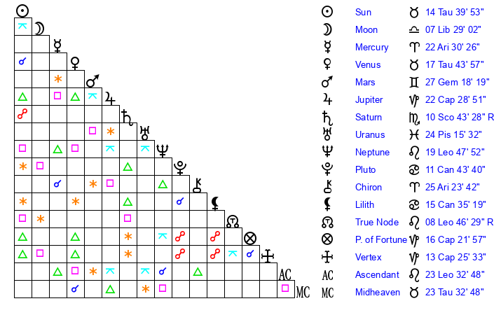 | Moon | 7 Libra 25 | 28 Leo 42 | 16 Gemini 50 |
