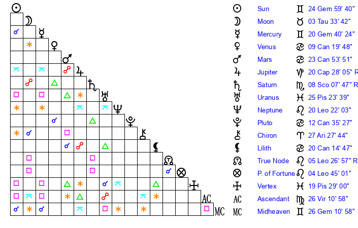 | Moon | 3 Taurus 30 | 29 Aquarius 19 | 20 Sagittarius 55 |