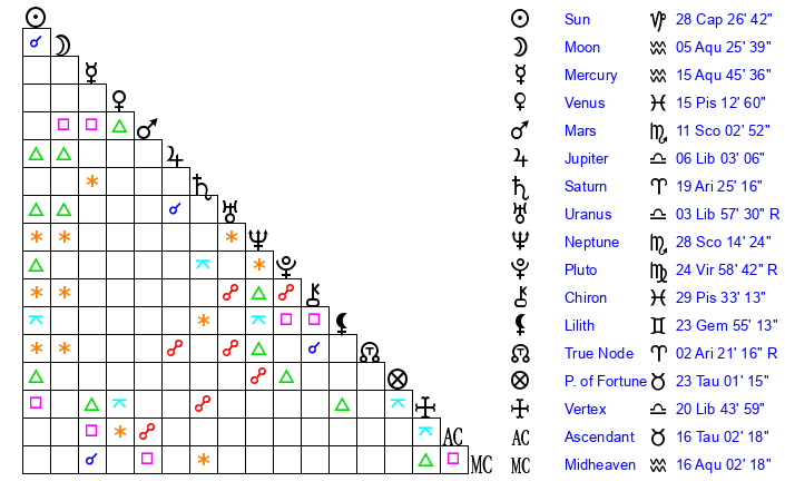 | Moon | 5 Aquarius 27 | 24 Virgo 40 | 22 Aquarius 59 |