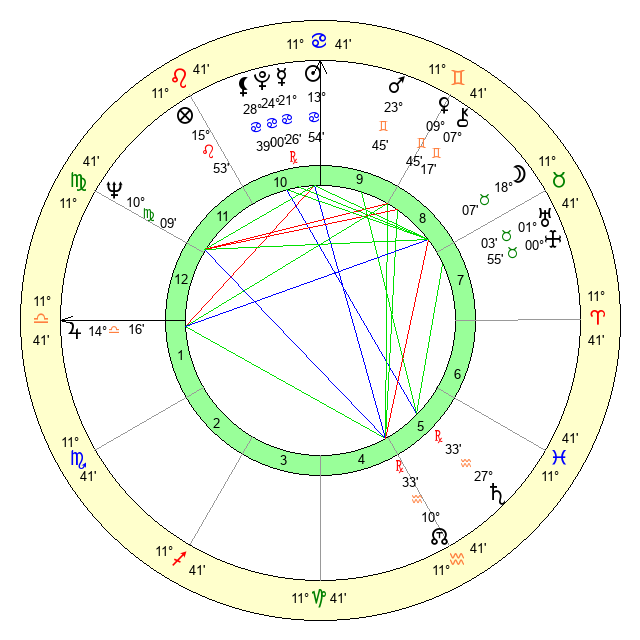 | Moon | 18 Taurus 6 | 27 Scorpio 25 | 8 Virgo 19 |