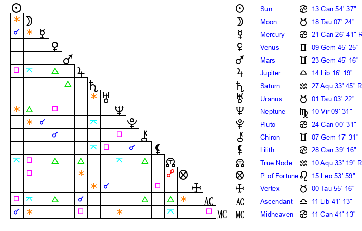 | Moon | 18 Taurus 6 | 27 Scorpio 25 | 8 Virgo 19 |