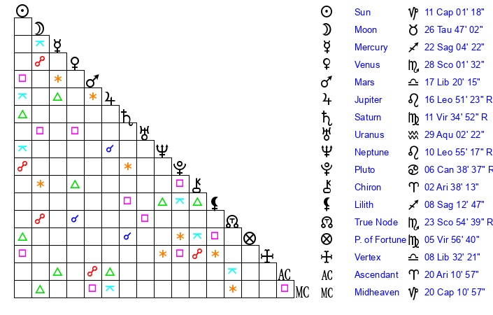 | Moon | 27 Taurus 2 | 17 Aquarius 5 | 27 Pisces 20 |
