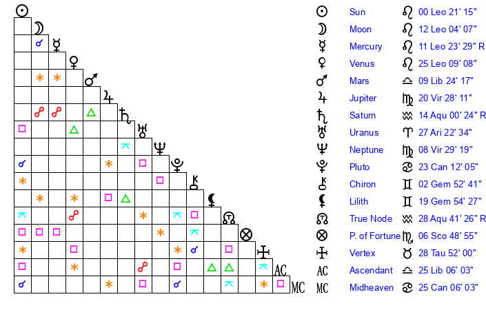 | Moon | 12 Leo 13 | 16 Cancer 48 | 0 Capricorn 17 |