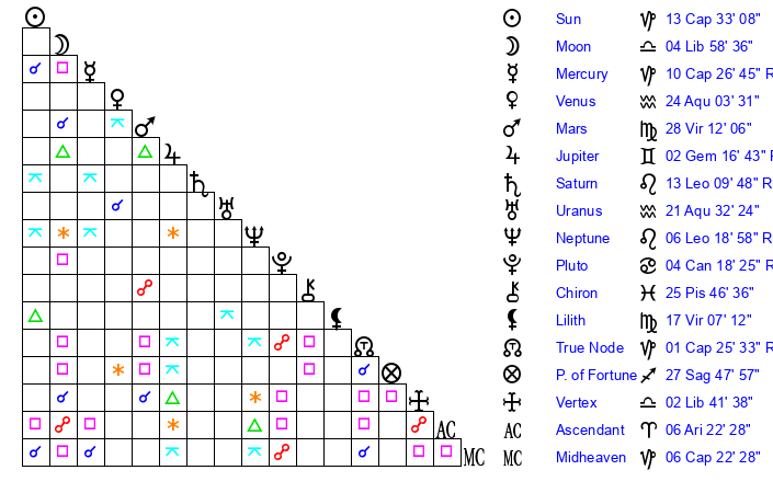 | Uranus | 21 Aquarius 30 | 23 Taurus 34 | 26 Aquarius 58 |