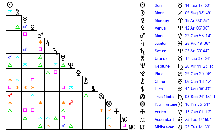 | Sun | 14 Taurus 17 | 15 Taurus 27 | 6 Leo 37 |