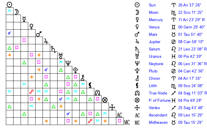 | Mercury | 11 Aries 23 | 1 Aries 3 | 28 Leo 59 |
