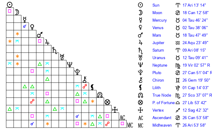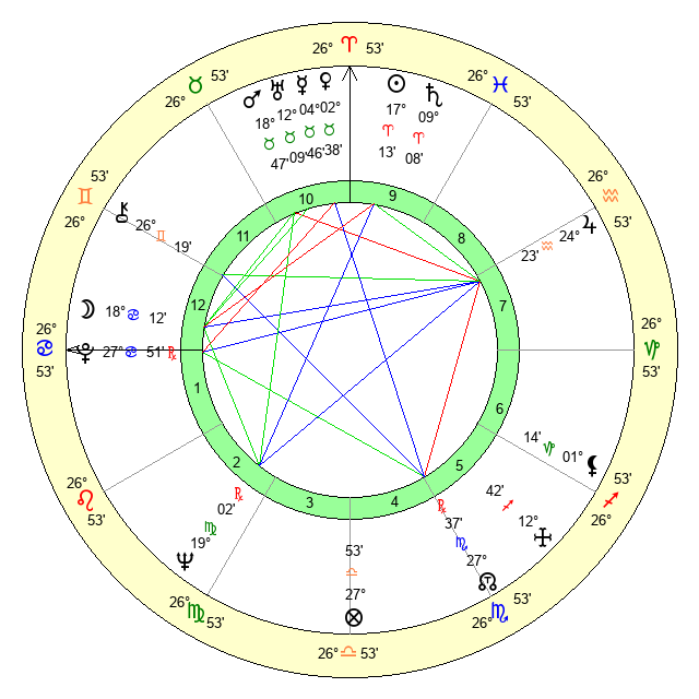 | Sun | 17 Aries 13 | 18 Aries 7 | 11 Cancer 5 |