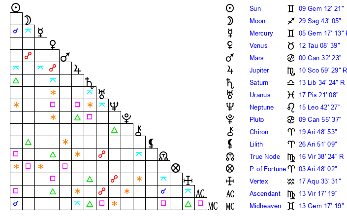 | Sun | 9 Gemini 12 | 10 Gemini 29 | 16 Virgo 57 |