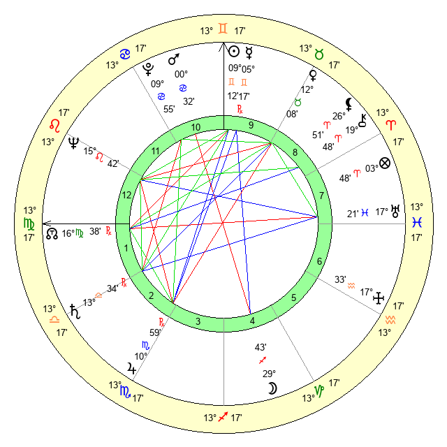 | Jupiter | 10 Scorpio 41 | 27 Gemini 56 | 14 Scorpio 36 |