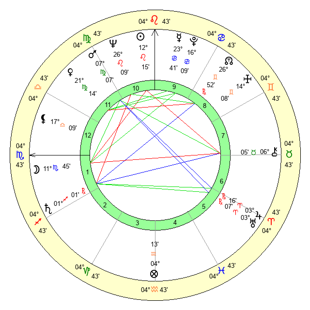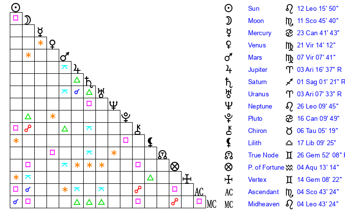 | Moon | 11 Scorpio 47 | 29 Sagittarius 56 | 21 Gemini 56 |