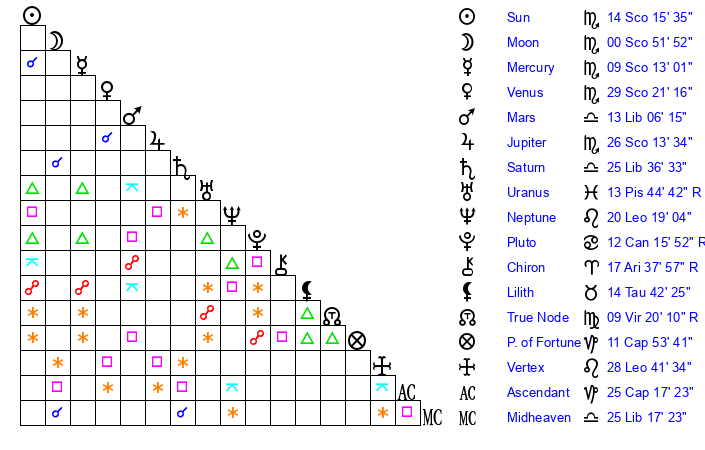 | Saturn | 26 Libra 10 | 25 Pisces 25 | 2 Scorpio 54 |