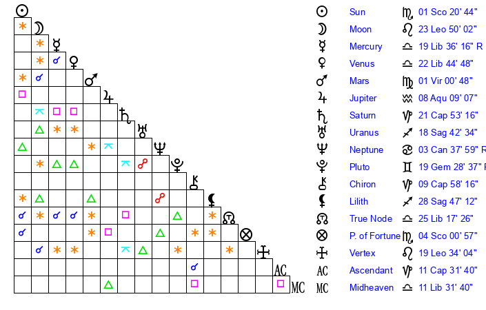 | Moon | 23 Leo 45 | 18 Sagittarius 11 | 16 Aquarius 25 |