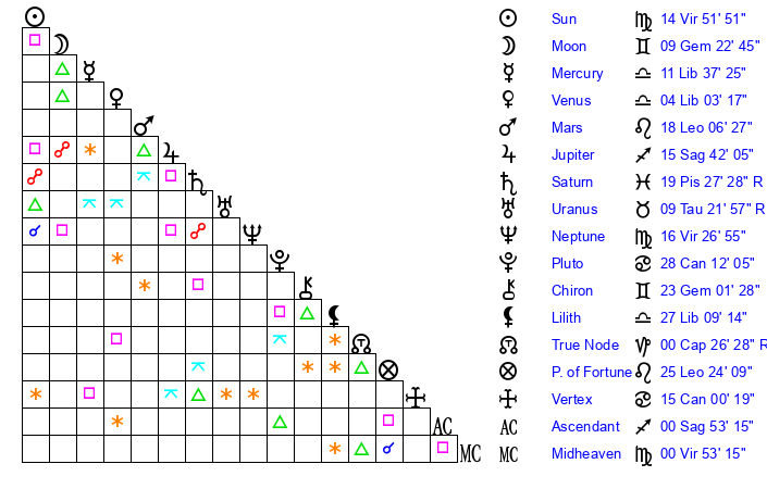 | Moon | 9 Gemini 16 | 14 Pisces 39 | 12 Virgo 49 |