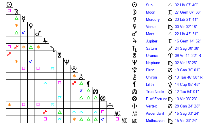 | Uranus | 9 Aries 40 | 1 Gemini 19 | 7 Aries 31 |