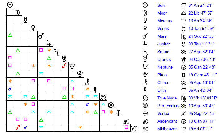 | Sun | 1 Aries 25 | 2 Aries 19 | 27 Cancer 16 |