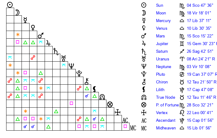 | Moon | 18 Virgo 13 | 24 Capricorn 21 | 14 Pisces 8 |