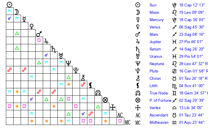 | Sun | 18 Capricorn 12 | 19 Capricorn 41 | 25 Aries 28 |