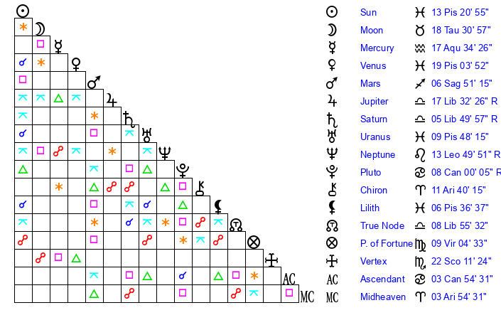 | Saturn | 6 Libra 34 | 21 Pisces 4 | 1 Libra 37 |