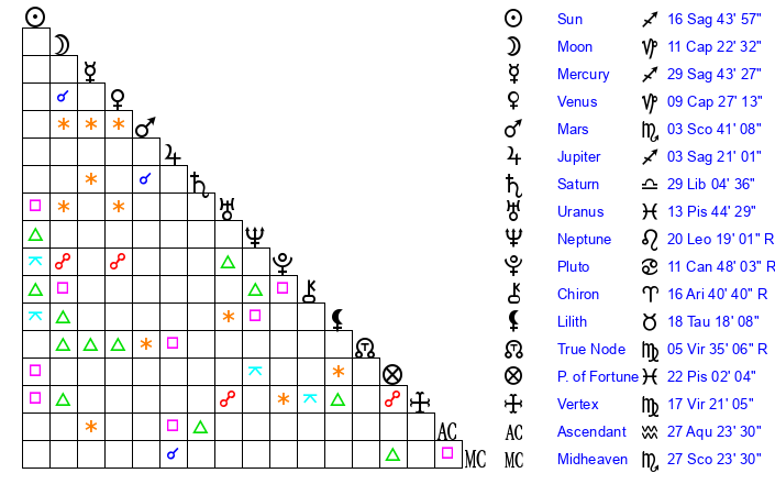 | Sun | 16 Sagittarius 44 | 18 Sagittarius 0 | 29 Pisces 56 |