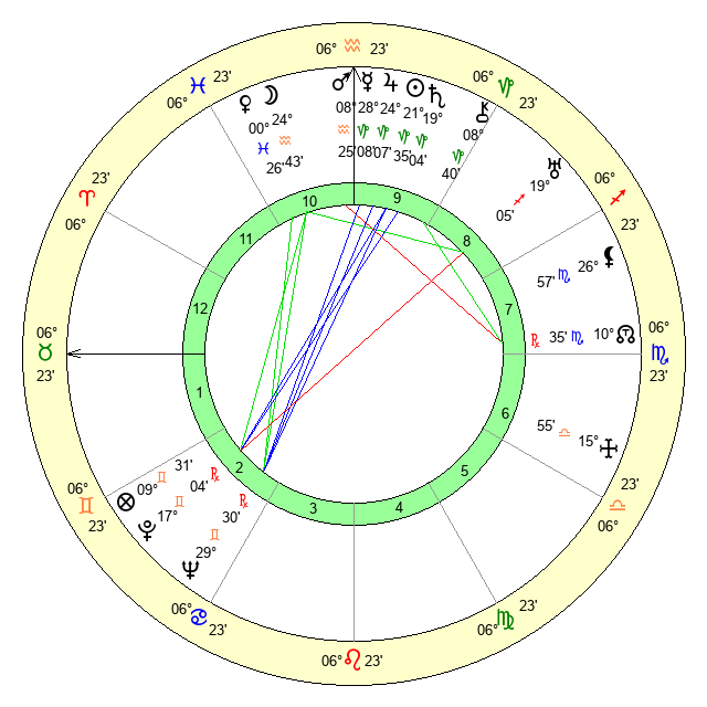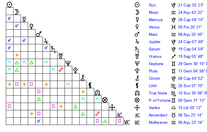 | Jupiter | 23 Capricorn 54 | 12 Gemini 8 | 16 Aquarius 14 |