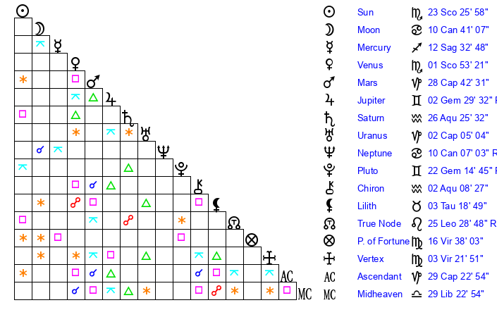 | Sun | 23 Scorpio 26 | 24 Scorpio 20 | 24 Pisces 57 |