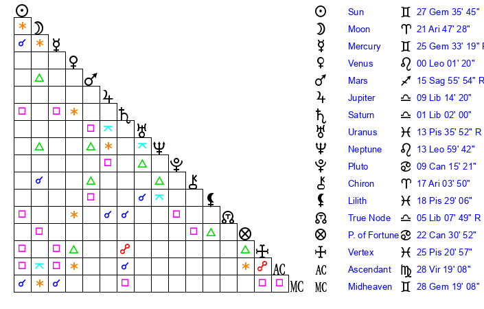 | Sun | 27 Gemini 36 | 28 Gemini 40 | 6 Libra 44 |