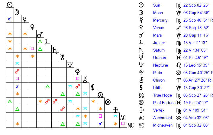 | Sun | 22 Scorpio 2 | 22 Scorpio 34 | 8 Pisces 34 |
