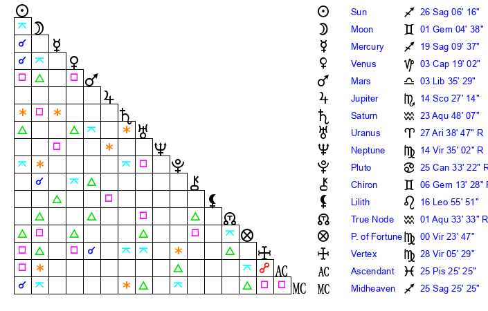 | Mercury | 19 Sagittarius 10 | 9 Sagittarius 1 | 0 Pisces 54 |