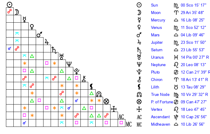 | Sun | 0 Scorpio 15 | 1 Scorpio 32 | 13 Aquarius 37 |