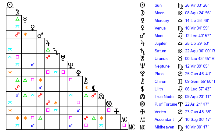| Neptune | 12 Virgo 39 | 0 Aries 51 | 14 Virgo 34 |